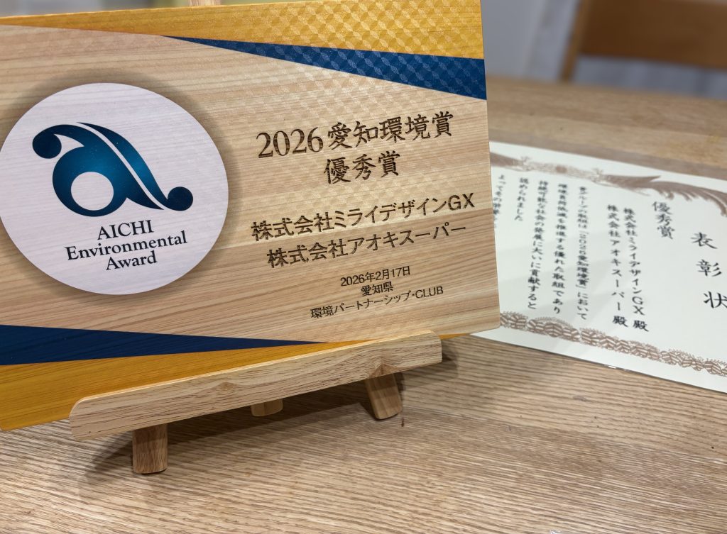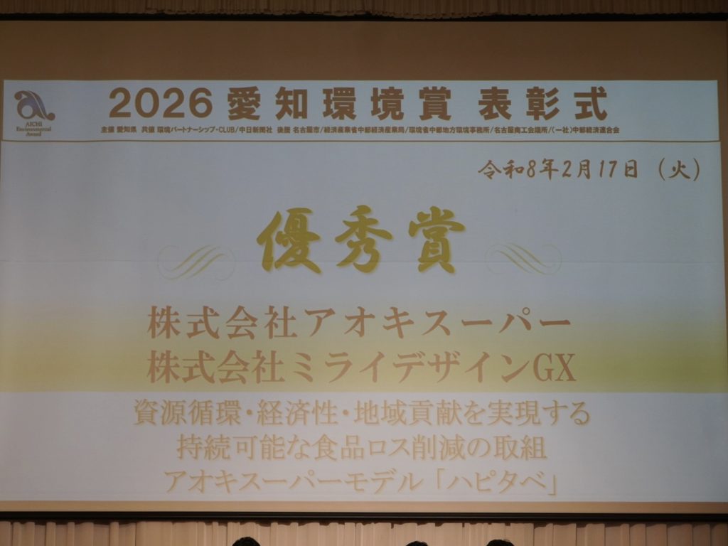 株式会社アオキスーパーと共同で2026愛知環境賞において『優秀賞』を受賞いたしましたのでご報告いたします。